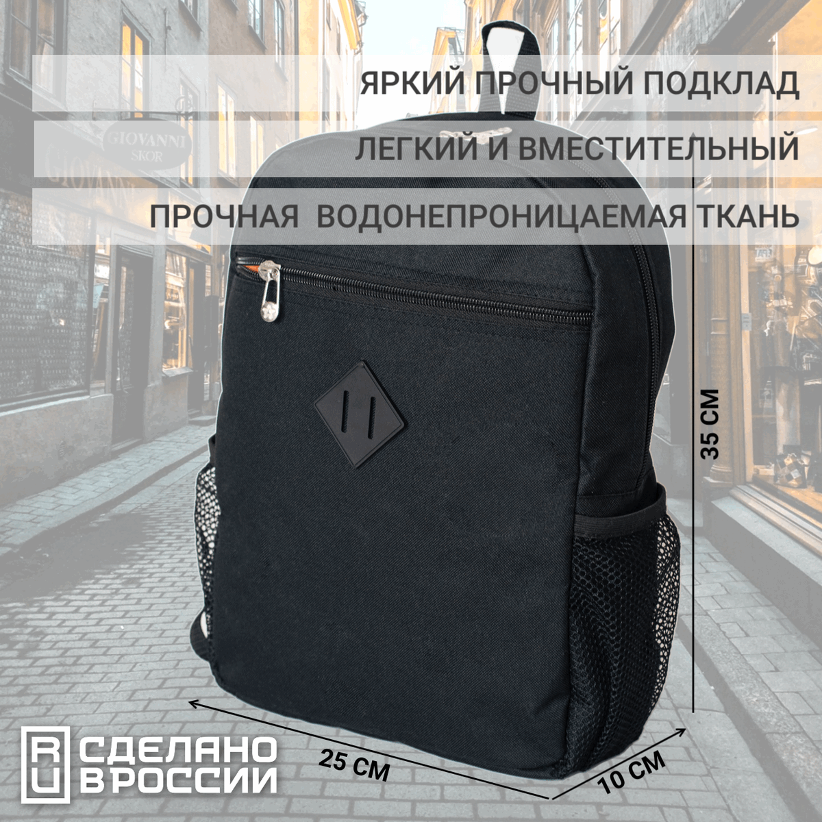 Рюкзак прямоугольной формы на каждый день небольшого размера выполнен из качественной ткани, внутри - прочный яркий подклад. Модель имеет один вместительный основной отдел на молнии, внутри карман для документов А4, планшета, а также карман на молнии для паспорта и ценных вещей, которые нужно спрятать от посторонних глаз. На передней стенке имеется большой разрезной карман на молнии, два боковых кармана из сетки на резинке. Спинка и заплечные лямки усилены пеной. Предусмотрено нагрудное крепление, чтобы рюкзак не спадывал с плеч.